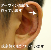また、後で説明するように、糸だけで縛った耳の形はどうしても不自然になります。通常は耳の前後面を切開し、軟骨膜を露出させてメス等を用いて形を整える必要があります。 術後は1週間程度耳全体を包み込むようにガーゼ等で圧迫する必要があります。
