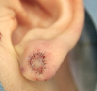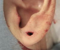 耳の後ろを切って軟骨を3カ所深く切開した上で糸で縫合したそうです。