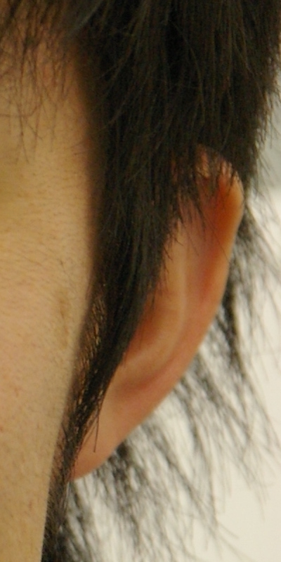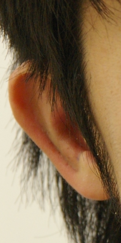 上記症例の詳細。片側の立ち耳。対耳輪の縦方向の曲がりが少ないだけでなく、耳の中央あたりが不自然に凹み、左側の正常な耳とはずいぶん形が異なっています。一般的に美容外科や形成外科で行われているような、耳の上方を後ろに折り曲げるだけの手術では改善できません。軟骨を自然に曲げるため一旦前面の皮膚を取り除いて軟骨に細かく浅い筋を入れて行きます。手術時間は片耳で1時間半〜2時間くらいかかります。