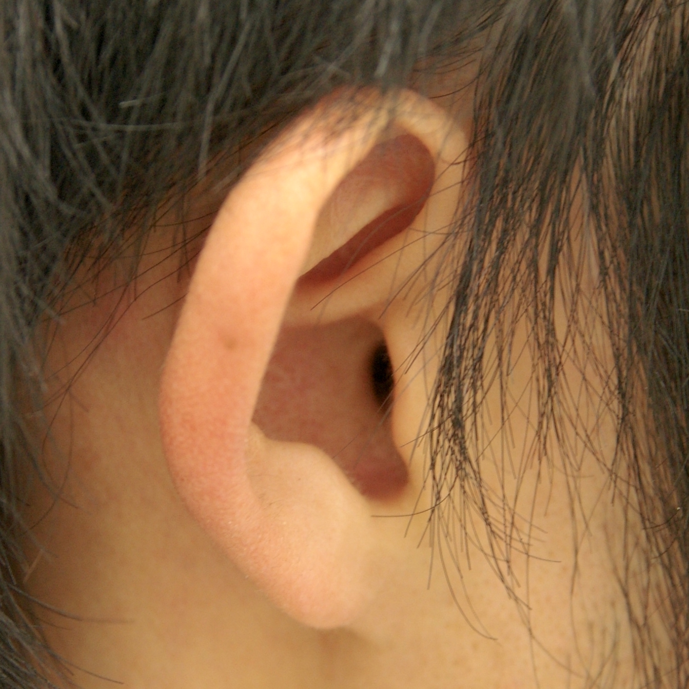例えばこのページのトップにあげた耳の写真は、写真素材を扱うサイトで見つけた「きれいな形の耳」です。シャープな線は対耳輪の下脚(第1脚)の部分のみです。立ち耳の手術では、対耳輪を鋭角に折ってはいけません。