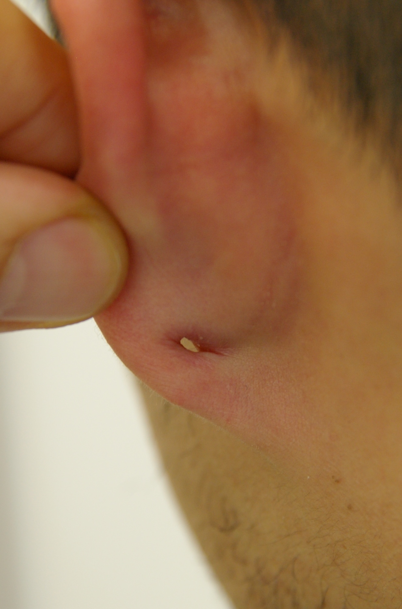 ピアスホールを閉じる手術。小さな穴にガイドの針やブジーをガイドとして通し、それに沿わせて2ミリパンチで前後にある穴の間をつないでいる薄い皮膚のトンネルを残さず摘出する。取り残しがあると耳の中に皮膚の島が取り残されて粉瘤のような腫瘤を生じる。