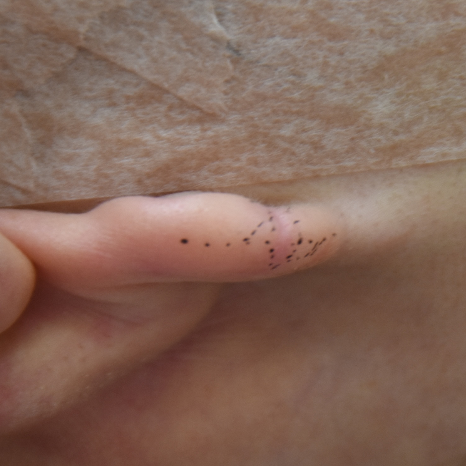 通常は耳たぶに麻酔の注射をして皮膚を緊張させ、穴の周囲の傷跡の大きをを見極めたら、できるだけ細い皮膚生検用パンチを用いて表から裏まで綺麗に皮膚を取り除きます。細い金属棒を通してその周囲を滑らせるように皮膚をカットし、取り残しがないか詳細に調べ、問題がないようであれば両側の皮膚を丁寧に縫合します。
