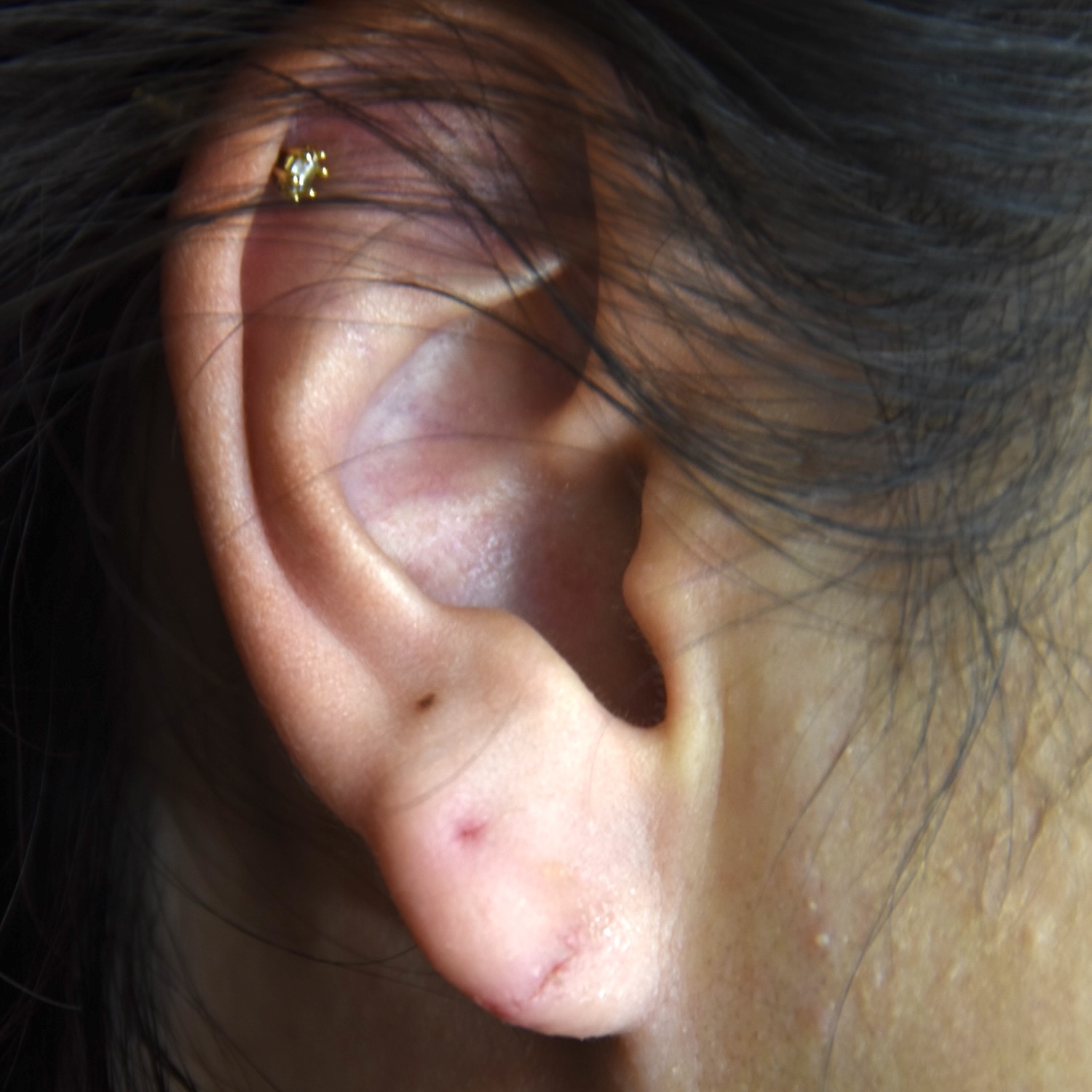トラブルを起こして使わなくなった場合などは、周囲に傷跡の組織が残り、場合によってはすり鉢状に穴の周囲が凹んでいることがあります。こうした場合単純な縫合では手術後も穴が空いたように見えてしまうことがあります。(鼻や唇などのピアスでも同じです)