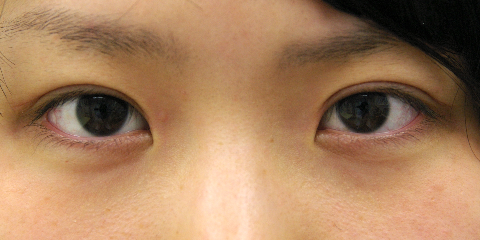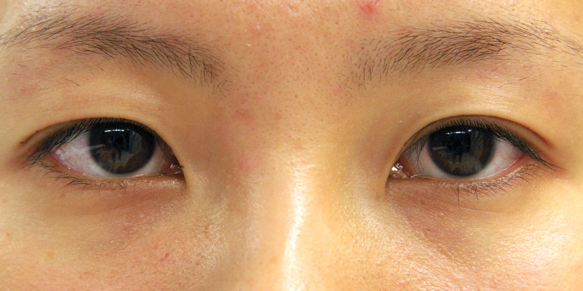 若い患者さんの症例:まだニキビの目立つ10代の学生さんです。初診時はニキビのご相談でしたが、約1ヶ月の治療でニキビが軽快したため、埋没法で重瞼を行うことにしました。瞼は比較的薄く、たるみもわずかなので、切開法よりもダウンタイムの少ない埋没方を選択しました。術後写真は手術翌日(術後1日目)です。糸の跡がまだ目立ちますが、目を開けていれば不自然ではありません。