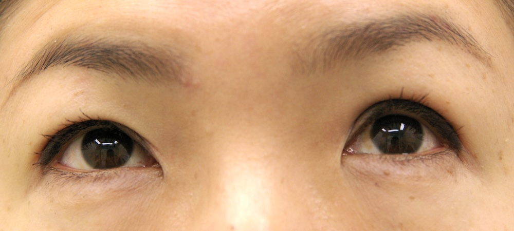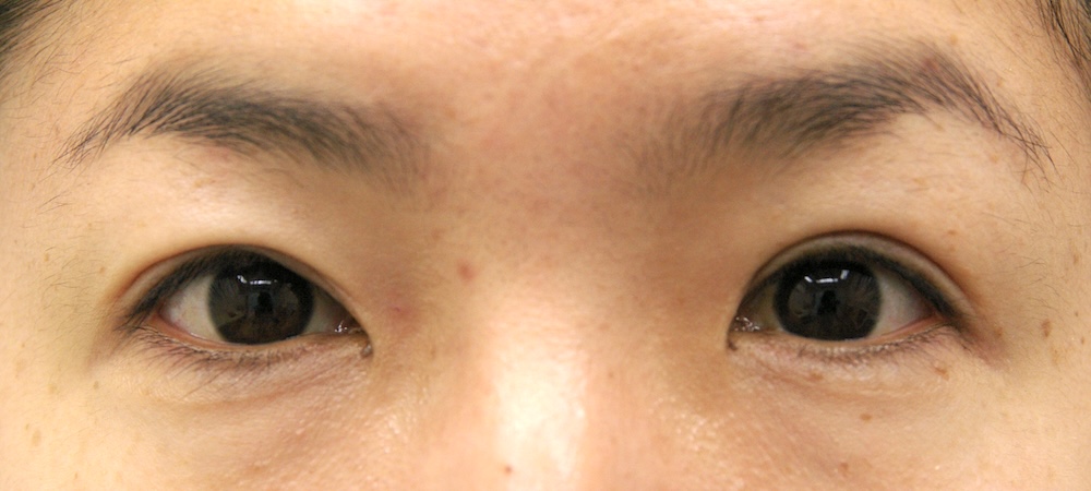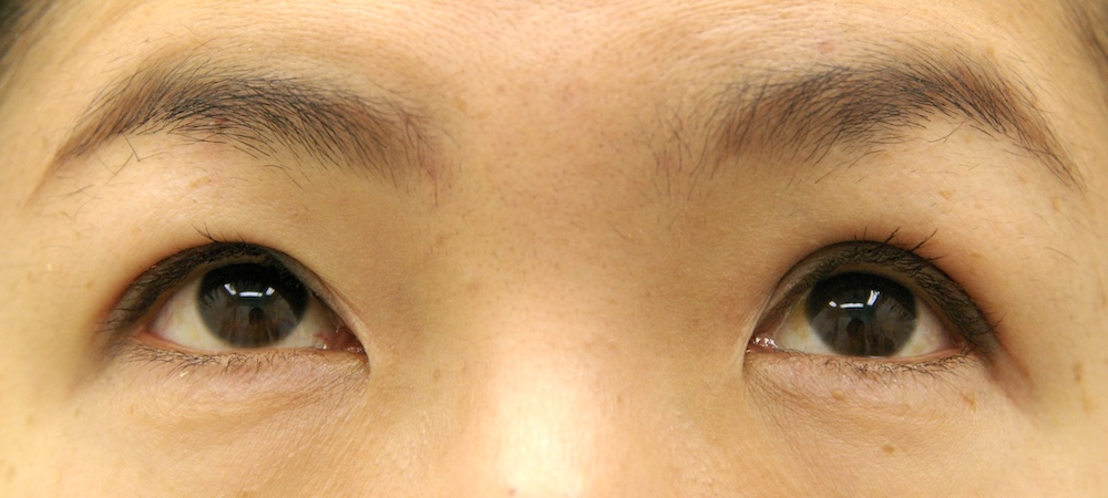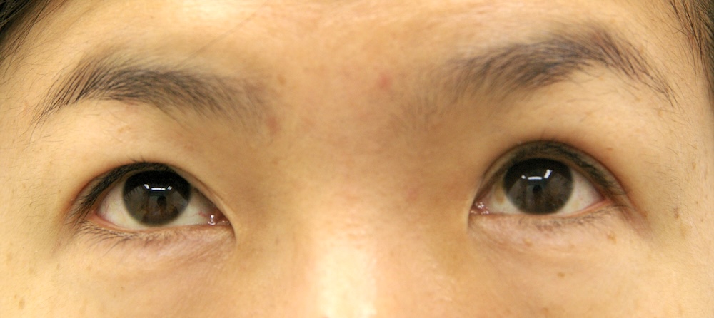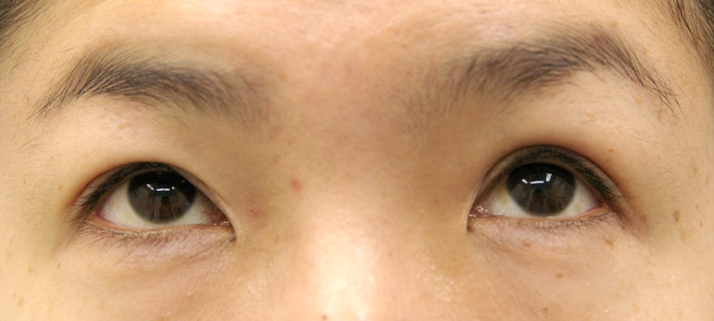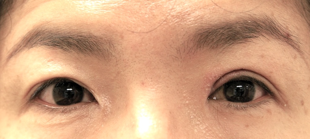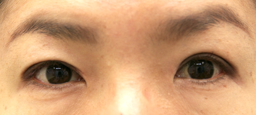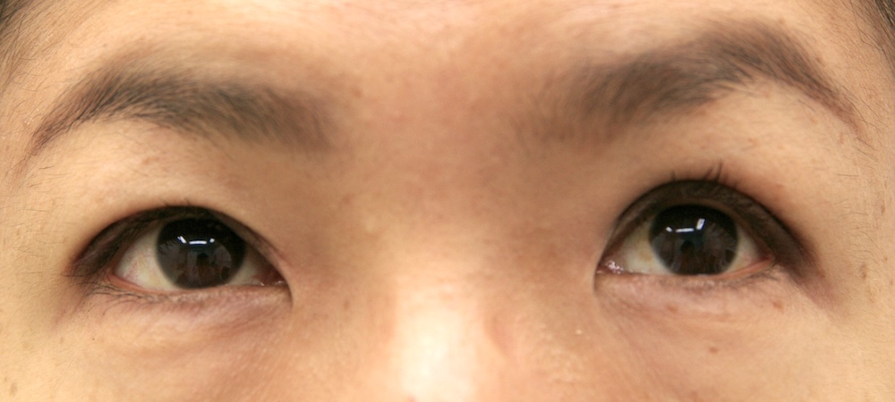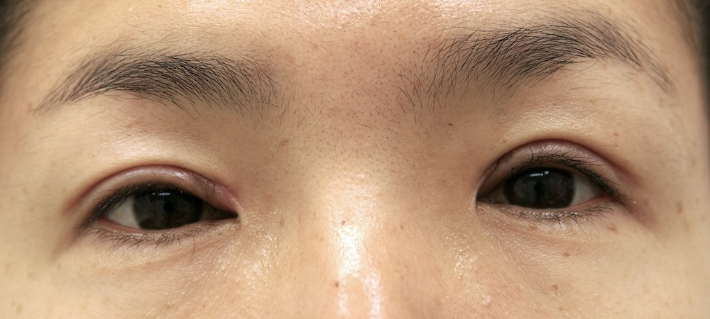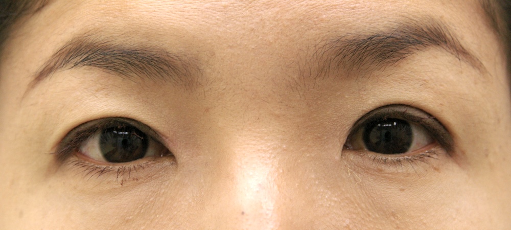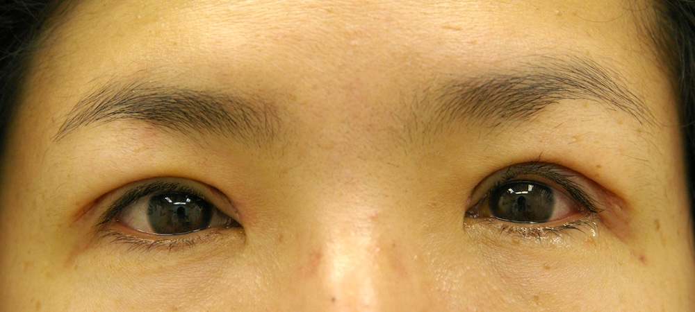 コメント: 一重瞼の患者さんは瞼(縁)は下がっておらず、確かに上方視は障害されているとはいえ、瞼の動きそのものには異常がないので、眼瞼挙筋前転法で手術する必要はなく、普通の重瞼手術(埋没法でも切開法でも)で症状は改善するはずです。しかしこの患者さんの場合、挙筋機能の低下が見られ単純な一重瞼とは言えないようでした。