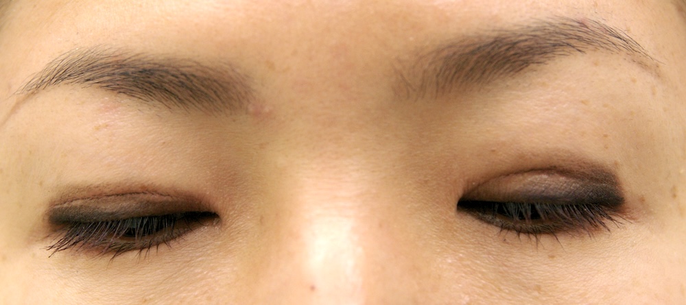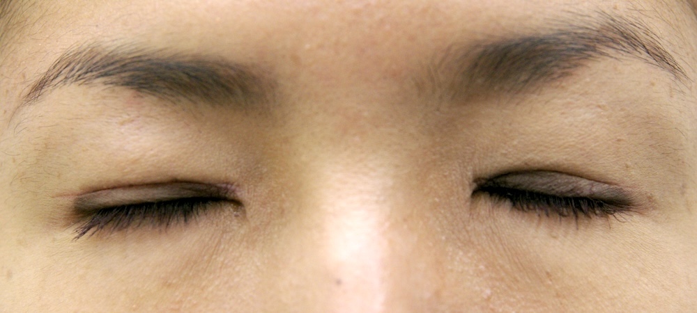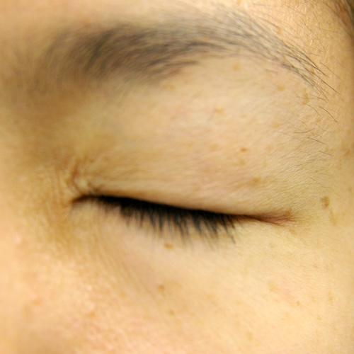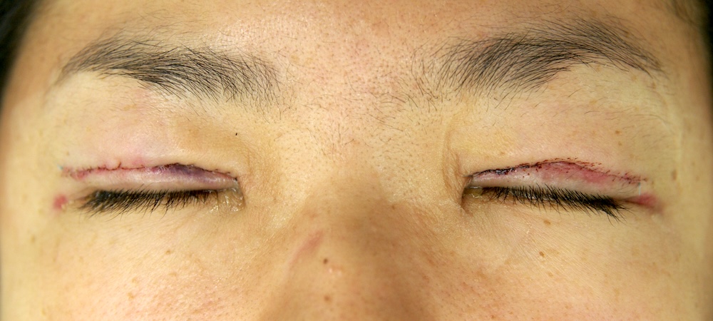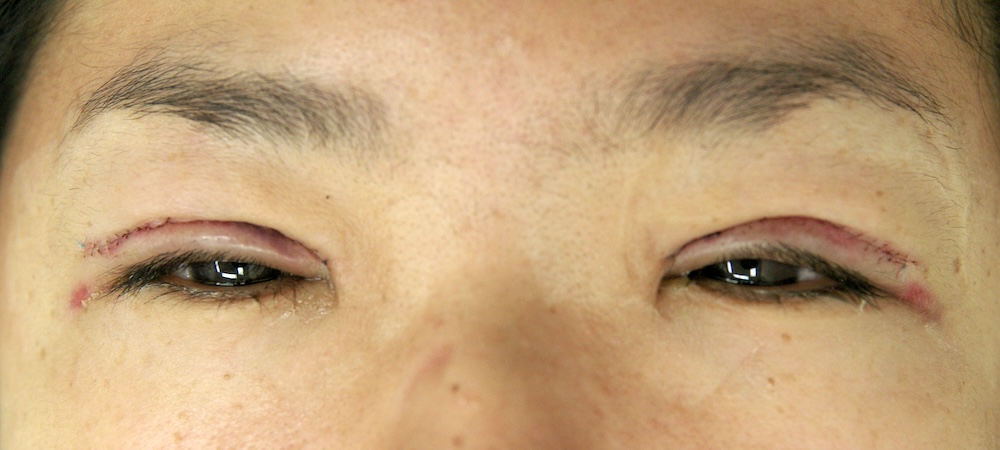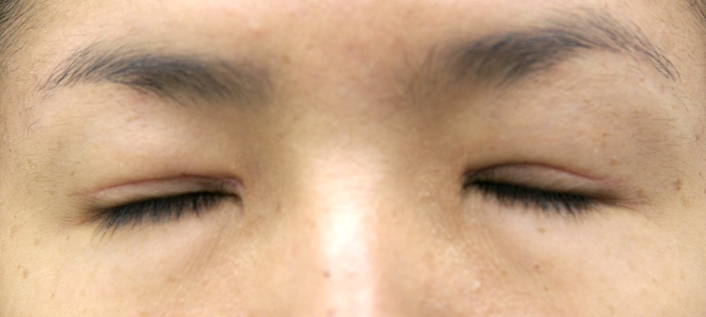 まだ切開した傷跡ははっきり見え、目をしっかり閉じると目頭に皺がよります。