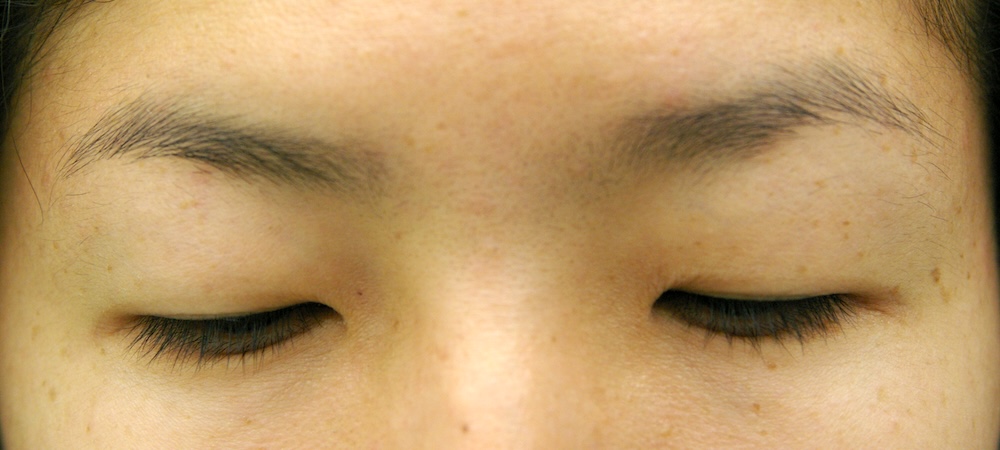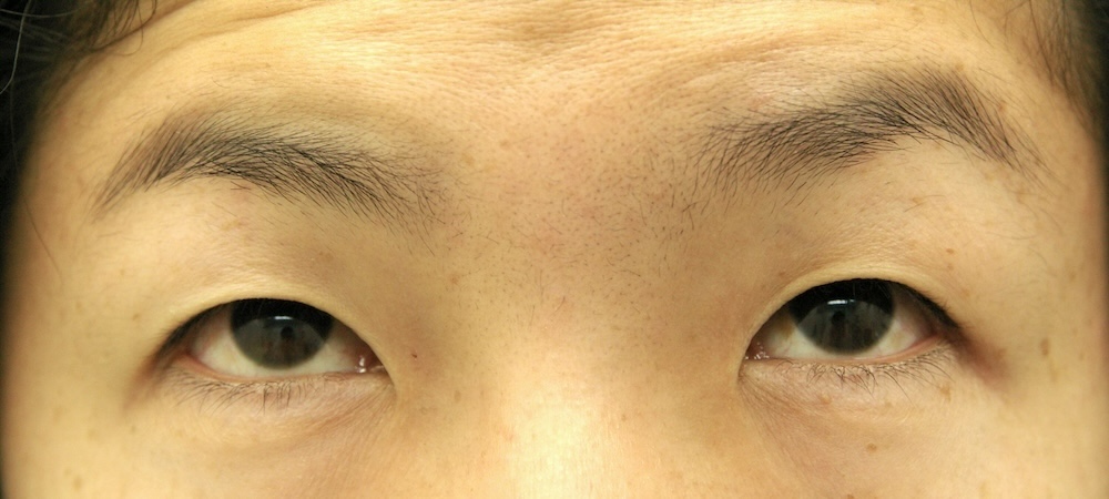 瞼裂やや狭小ですが、眼瞼縮小症候群の特徴である逆内眼角贅皮は見られず程度も軽いので病的なものではなさそうです。下垂も軽度でごく普通の一重瞼と言えなくもないのですが、挙筋機能がうまく計れず眉を上げないと上方視できないことから、先天性の素因もあるのではないかと思いました。視力は左右差がありますが正常範囲で、悪い方の眉挙上が見られます。